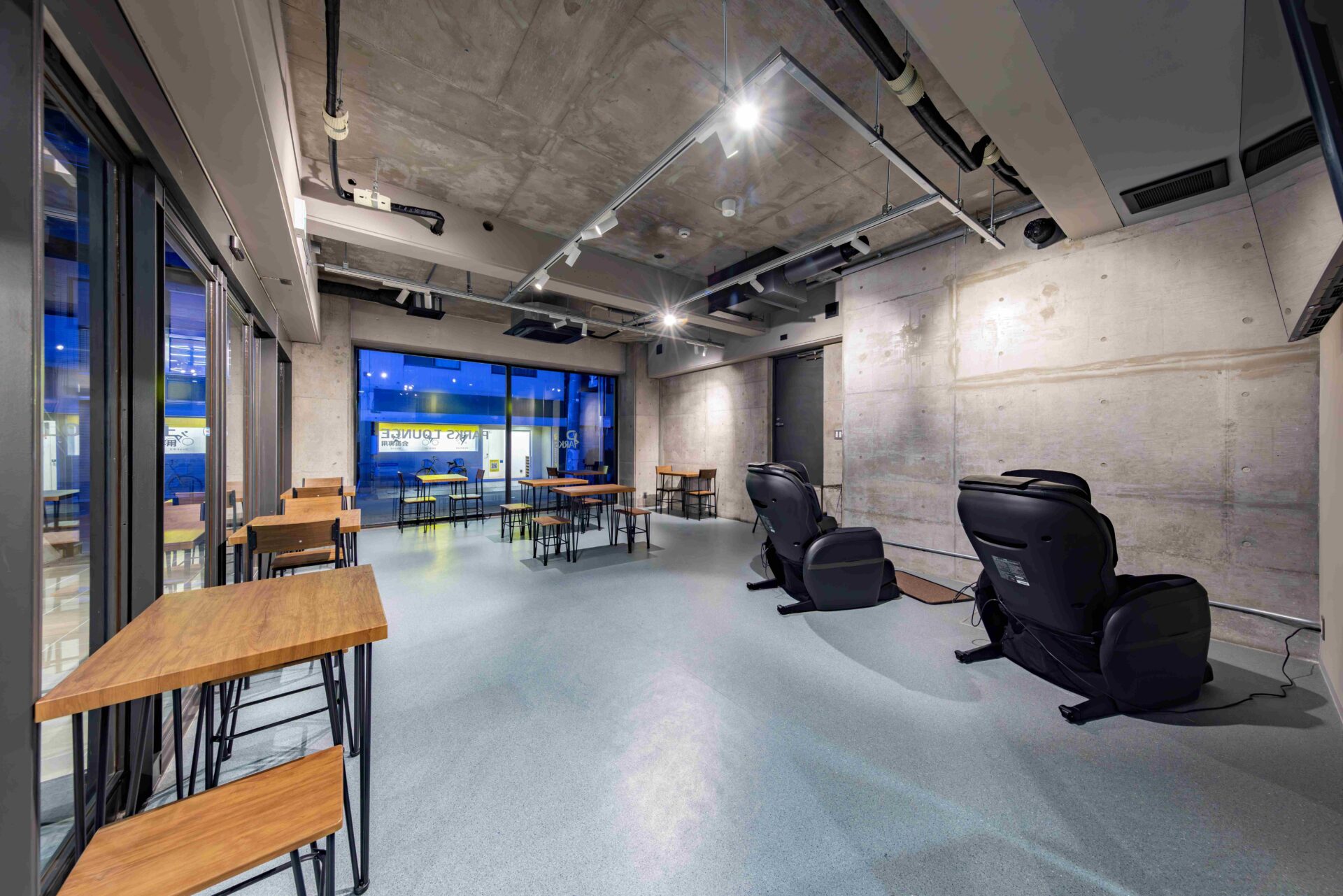 こちらのエリアではイス、テーブル、コイン式全自動マッサージ機をご用意しています。