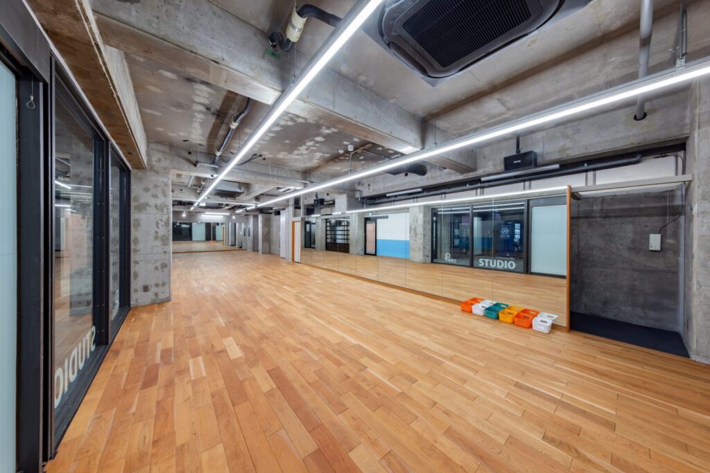 当ビルは2Fが24時間利用可能なフィットネスジム、1FはSTUDIO PARKS(レンタルスタジオ)、女性専用フィットネスジムエリア、会員専用LOUNGEとなっております。レンタルスタジオではJDACダンススクールも開校します。